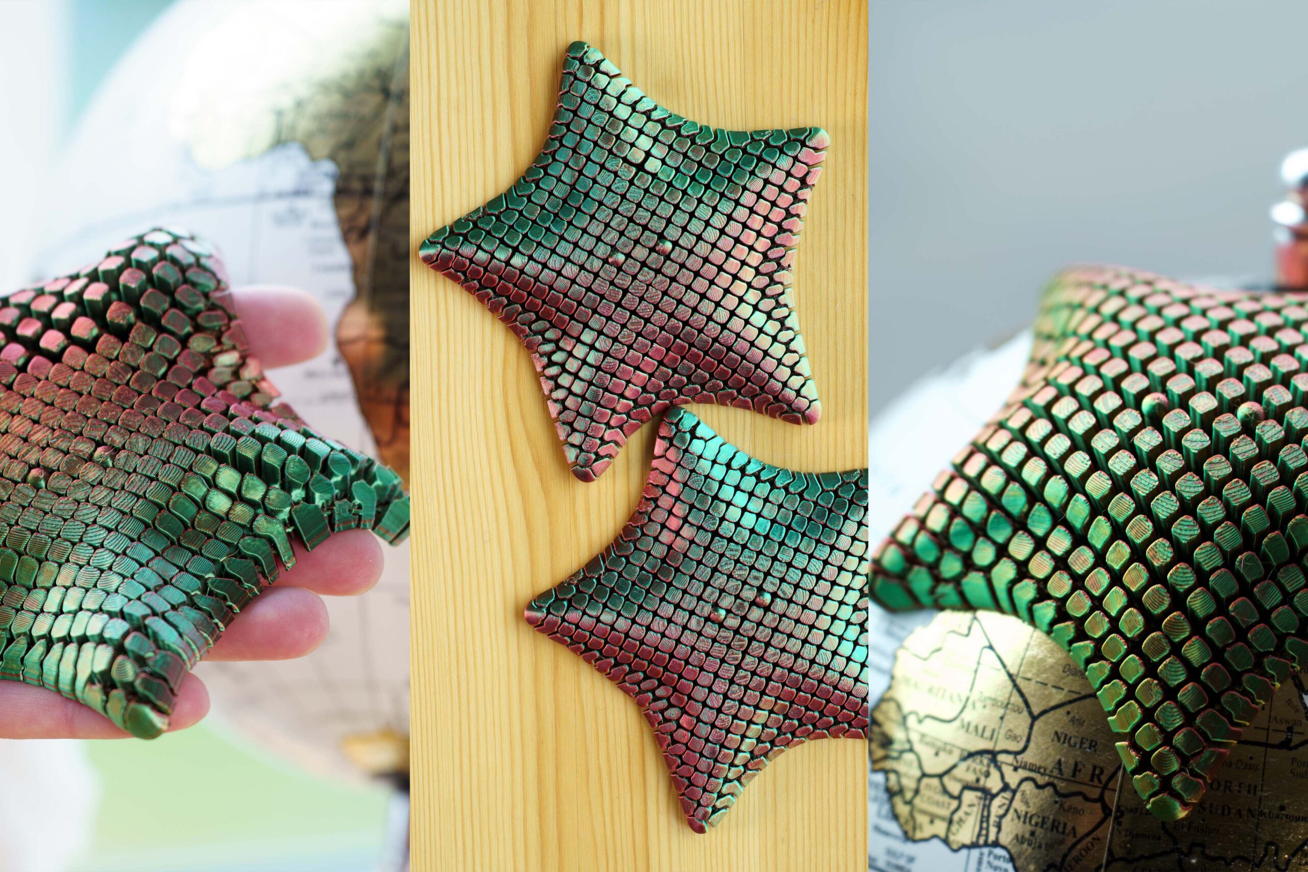 See meritähekujuline sensoorne ese ühendab kauni välimuse, rahustava puudutuse ja mängulise funktsionaalsuse. Selle pind koosneb siledatest, läikivatest soomustest, mis muudavad värvi rohelisest roosani olenevalt valgusest ja liigutusest – justkui elav kaleidoskoop sinu käes.