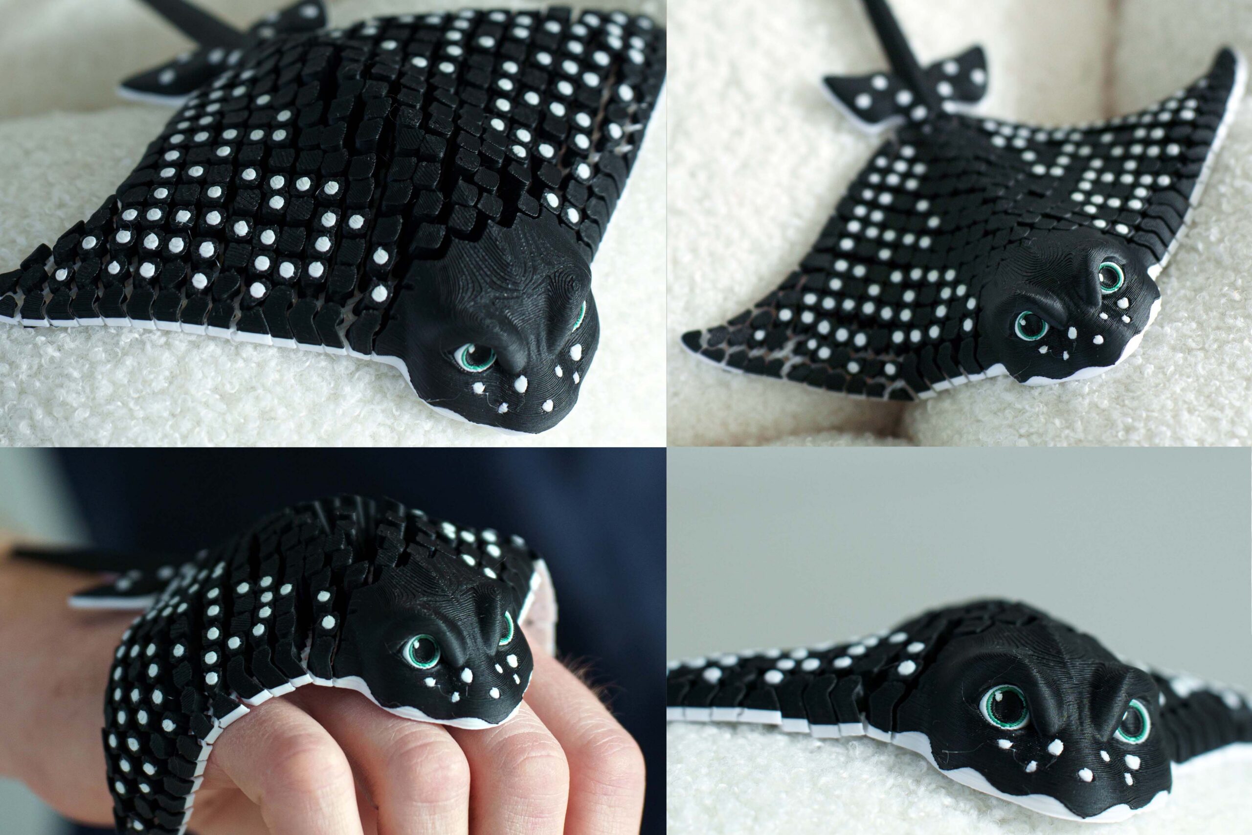 • Armas ja realistlik disain: musta ja valge täpiline muster ning suured helkivad silmad muudavad selle elavaks ja sõbralikuks tegelaseks.